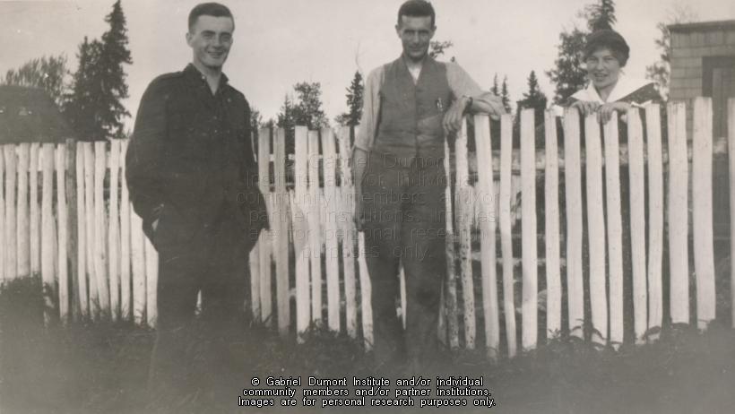 | Description: | Two men and lady by fence. Trip of Christina Bateman and Annie McKay to La Ronge. |