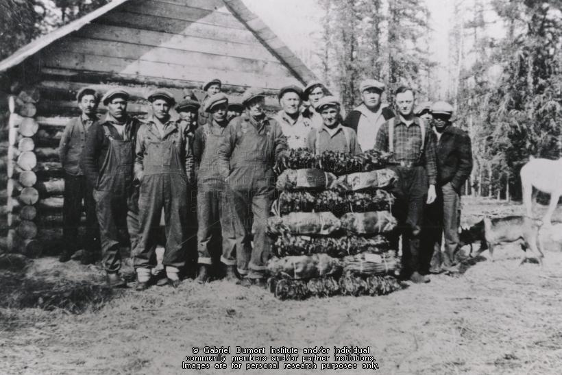 | Description: | People from Beauval and White Fish Lake with furs at Beaupre Lake, 1945. |