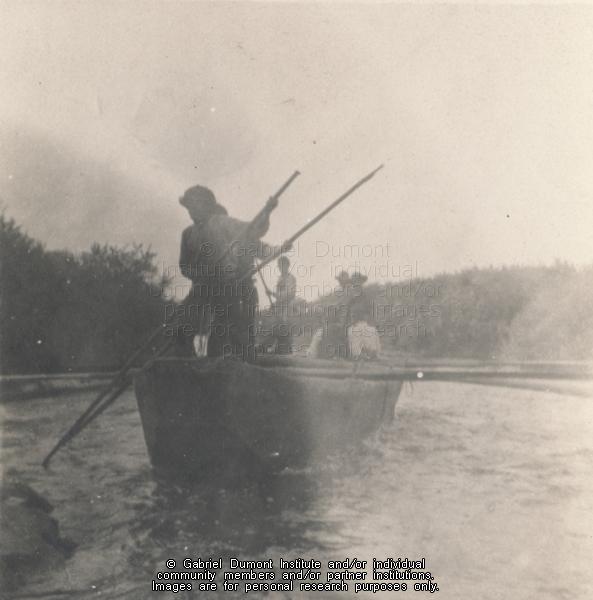 | Description: | Image of First Nations or Métis on a flatboat on the Montreal River on their way to Lac la Ronge, SK. |