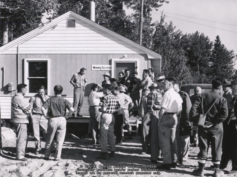 | Description: | Claim stakers lined up outside the Department of Mineral Resources recording office in La Ronge to get their copies of the new map.  Friday, July 12, 1957.