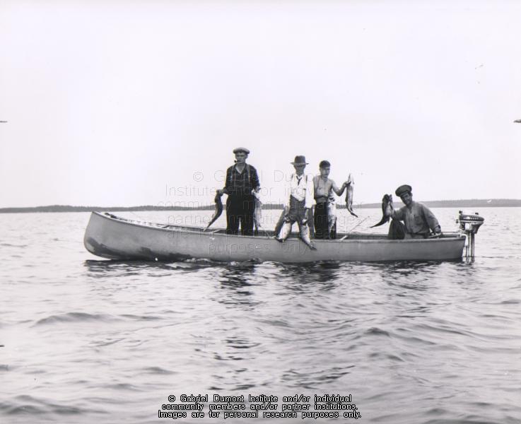 | Description: | Four men in a boat trout-fishing at Lac la Ronge, SK in 1950. |