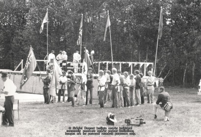 | Description: | Voyageur canoeists from Edmonton to Fort Garry. Robin Karpan kneeling, July 12, 1985 at the North-West Centennial celebrations, Fort Pitt.