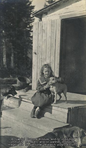 | Description: | Daughter of John O. Groat, Hudson's Bay Company manager, with dogs at the Hudson's Bay Company post at Portage La Loche SK, September 1908. From the Frank J.P. Crean fonds.