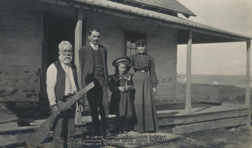 | Description: | Mr. and Mrs. John O. Groat (HBC manager), and their daughter, with an unidentified older man at the Hudson's Bay Company post at Portage La Loche, SK, September 1908. From the Frank J.P. Crean fonds.