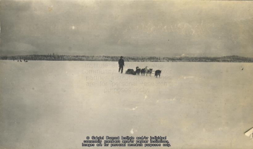 | Description: | A dog team crosses a frozen lake, Buffalo Narrows, SK, 1908-1909. From the Frank J.P. Crean fonds. |