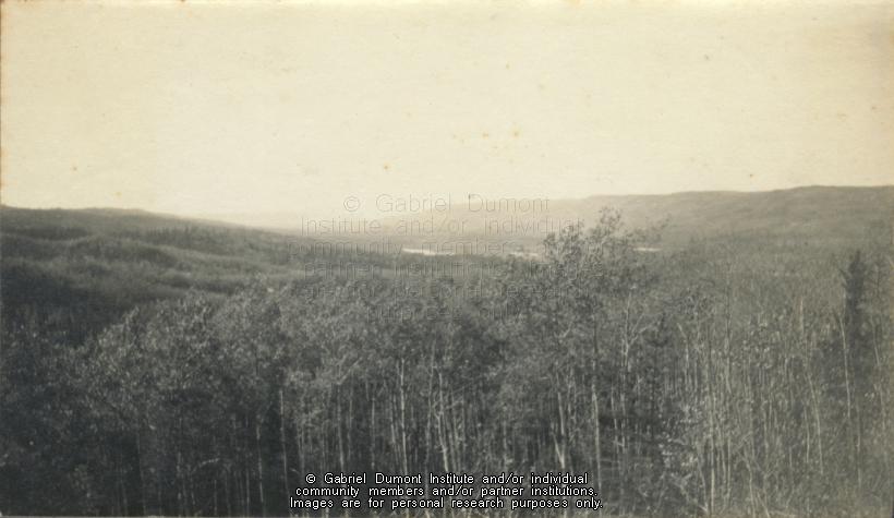 | Description: | Tree covered valley near the Clearwater River looking west from the heights at Portage La Loche (Methye Portage), SK, September 1908. From the Frank J.P. Crean fonds.