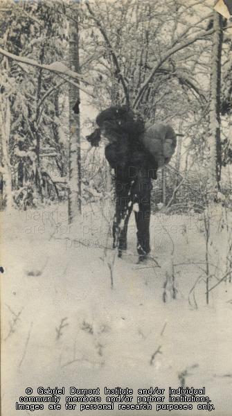 | Description: | Unidentified man carrying a back pack travelling in winter, (possibly a member of the New Northwest Exploration Expedition), northern Saskatchewan, 1908-1909. From the Frank J.P. Crean fonds.