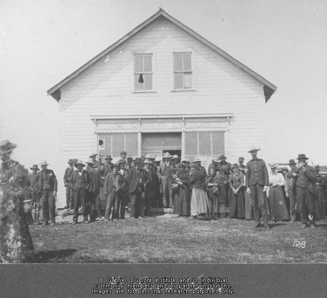 | Description: | A group of people at Duck Lake at the time of the visit by the Half-Breed Commissioners, 1900. From the Narcisse-Omer Cote fonds. |