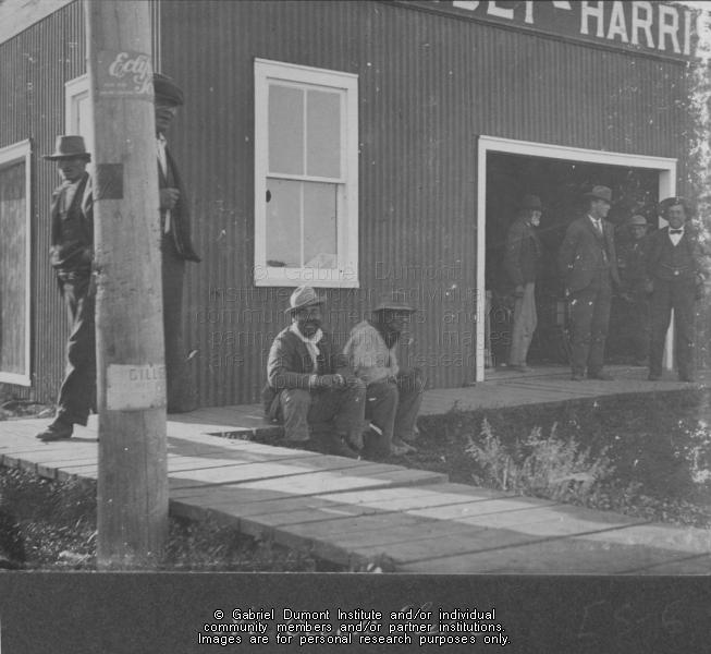 | Description: | A group of people beside the Massey-Harris dealership at Duck Lake, at the time of the visit by the Half-Breed Commissioners, 1900. From the Narcisse-Omer Cote fonds.