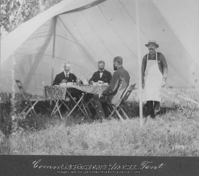 Description: The Half-Breed Commissioners' mess tent, with Commissioners seated at table, Duck Lake, 1900. Fthe Narcisse-Omer Cote fonds.