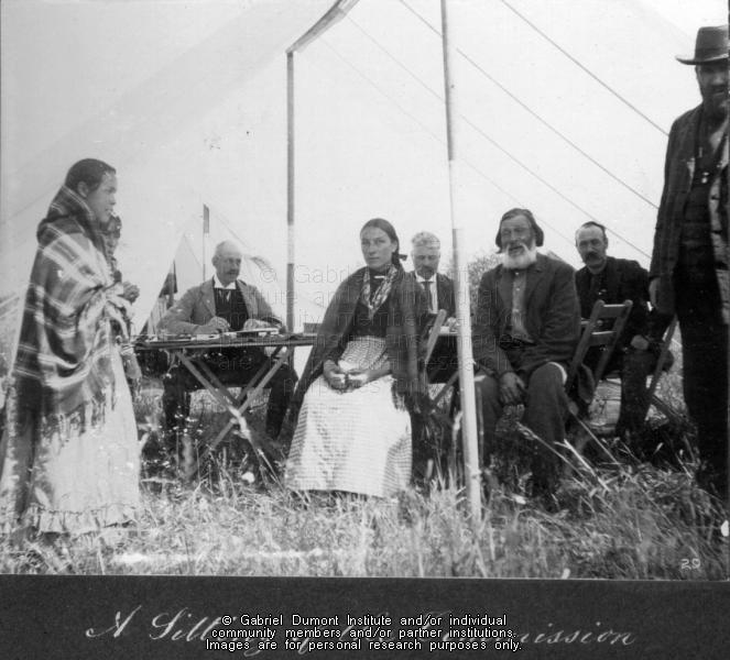 | Description: | Métis and Commissioners at a sitting of the Half-Breed Commission at Devil's Lake, near Sandy Lake Reserve, 1900. Part of the Narcisse-Omer Cote fonds.