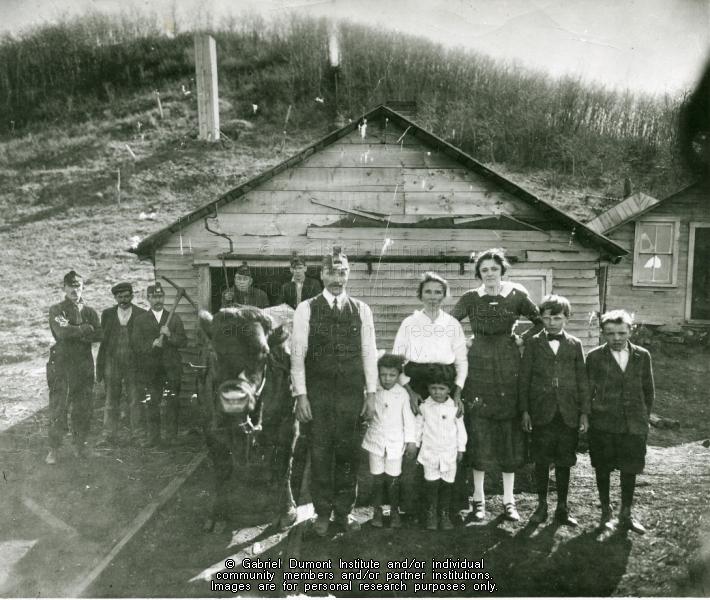 Description: Entrance to Salaba’s mine, Willow Bunch, in 1920. Mr. James Salaba, Mrs. J. Salaba, Mrs. Robert McGillis
