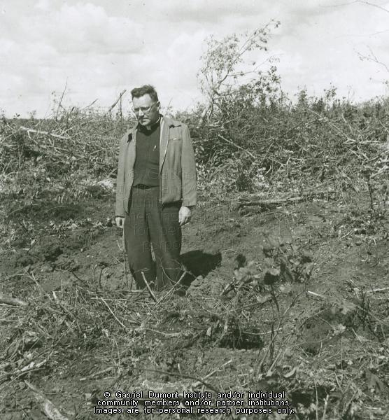 | Description: | “Father Dubuc standing in old shell hole on Batoche battlefield below village, July 30, 1953 |
