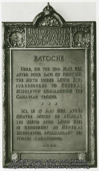 Historic Sites And Monuments Board of Canada Batoche A.D. 1947 The plaque reads, "Batoche - Here, on the 15th May, 1885, after four days of fighting, the Metis under Louis Riel surrendered to General Middleton commanding the Canadian troops. Ici, le 15 mai 1885, après quatre jours de combat, les Métis sous Louis Riel se rendirent au géneral Middleton, commandant des forces Canadiennes. A.D 1947" Same as SAB-R-A4041-2 |