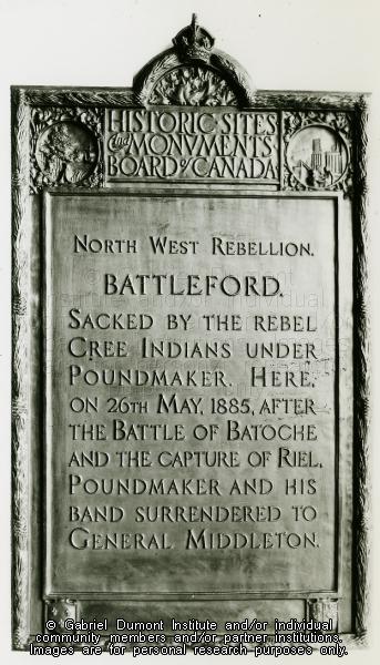 Historic Sites And Monuments Board of Canada North West Rebellion Battleford The plaque reads, "North West Rebellion. Battleford. Sacked by the rebel Cree Indians under Poundmaker. Here, on 26th May, 1885, after the Battle of Batoche and the capture of Riel, Poundmaker and his band surrendered to General Middleton." |