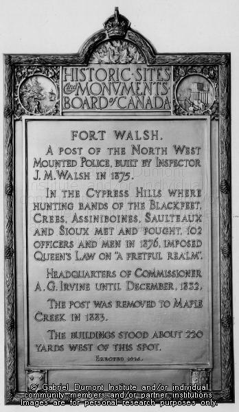 Historic Sites And Monuments Board of Canada Fort Walsh Erected 1926 The plaque reads, "Fort Walsh. A post of the North West Mounted Police, built by Inspector J.M. Walsh in 1875. In the Cypress Hills where hunting bands of the Blackfeet, Crees, Assiniboines, Saulteaux, and Sioux met and fought, 102 officers and men in 1876, imposed Queen's Law on a "fretfel realm". Headquarters of Commissioner A.G. Irvine until December, 1882. The post was removed to Maple Creek in 1883. The buildings stood about 220 yards west of this spot. Erected 1926." |