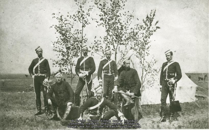 Officers at Humboldt (including Charles Mair), 1885 L to R: Major Dunn, Lt. Col. S.T. Denison, Capt. Denison, Lt. Merritt, Quartermaster Chas. Mair, Lt. Fleming, Surgeon Bladwin Please Credit Public Archives of Canada Same as RB-3931 |