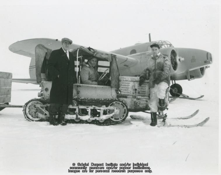 Land and Air Transportation C.H. Piercey, Admin. Of Education (in foregrounds) Tom Leia at wheel of weasel Air engineer Sinclair standing at right. March 31, 1949 |