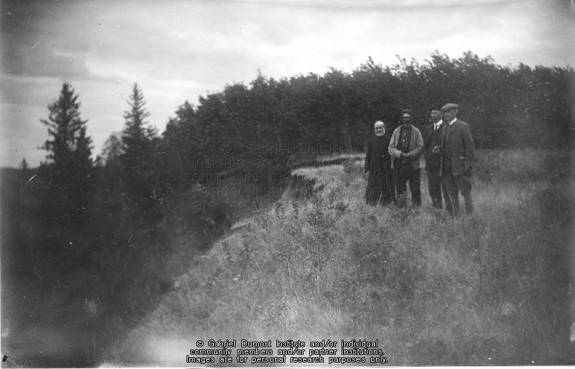 | Description: | Patrice Fleury, Wm. Grant, John Hawkes and Rev. Father _______ standing on top of precipice overlooking Old Buffalo Drive. Just east of mission and shrine at St. Laurent”.