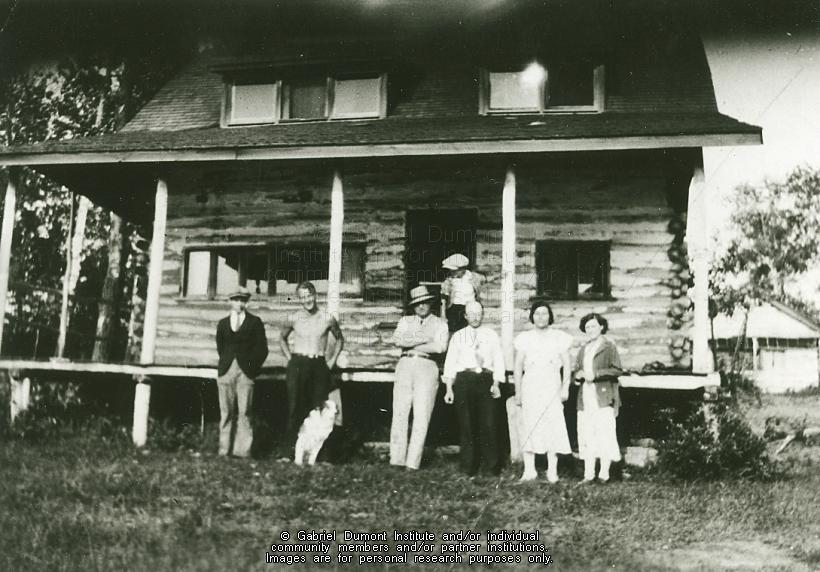 | Description: | Paulhus Family, Pozer Family in front of log house. |