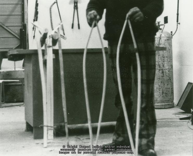 | Description: | Albert Daigneault – Ile-à-la-Crosse – Straightening snowshoes – Co-op Industries