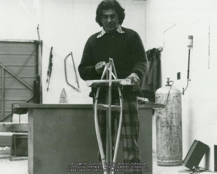 | Description: | Albert Daigneault – Ile-à-la-Crosse – Straightening snowshoes – Co-op Industries