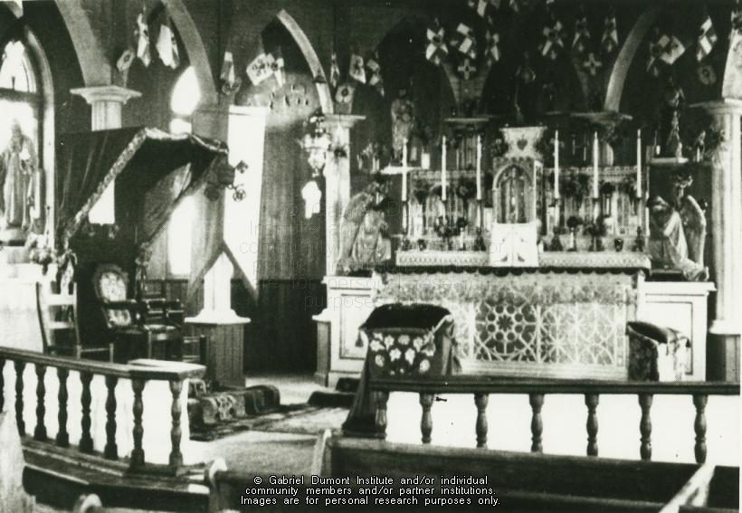| Description: | Interior of Church at Ile-à-la-Crosse, 1940s. |