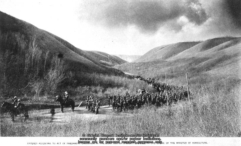 Description: Winnipeg Cavalry troop escorting 12th batt. (York rangers of Toronto) out of Ft. Qu’Appelle up Telegraph Hill