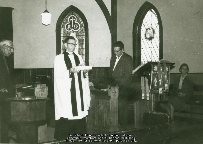 May 16, 1965 Rev. P. Cumberford accepts Cree bible from Mr. N. MacAuley – Commemorates 103rd birthday of Mrs. Caroline Sanderson Left Mr. Mathew Charles – only surviving brother of Mrs. Caroline Sanderson Mr. Charles Halkitt Lay Reader Cree Service Mrs. P. Cumberford – wife of Rev. P. Cumberford Photo- Mr. Gene Studer for Prince Albert Herald  |