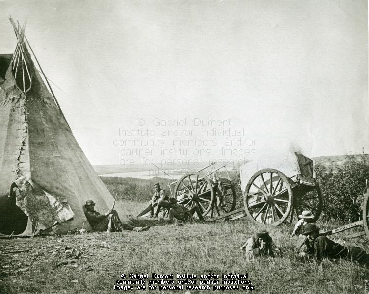 Description: "Camp at Elbow," the Sanford Fleming expedition camping near the North Saskatchewan River during the surveying of the original route of the CPR, 1871.