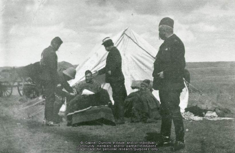 Middleton, Sir Frederick Dobson Please Credit Public Archives of Canada “The General and his wounded aides” – Peters Album I, p.29 Hospital tent in the zareba, Batoche. Gen. Middleton at right. Probably Col. von Straubenzie examining arm of wounded. |