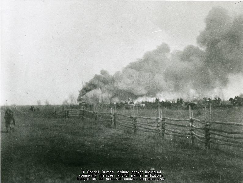 Batoche, Battle of Please Credit Public Archives of Canada “Opening the ball at Batoche” – Peters Album I, p.39 “First shell into Batoche”, Battle of Batoche, May 9, 1885. This photgraph was taken at 8:15 a.m. May 9, 1885 by Captain Peters and shows the first house burning from cannon fire at Batoche. The mounted scouts from either Boulton’s or French’s scouts led Middleton’s advance and can be seen in the picture. The fences in the foreground are the handmade fences of the Métis farmers who have retired to defend Batoche, in the distance beyond the horsemen in the foreground, left. Public Archives of Canada Similar to RA-7518 and RB-3666 |