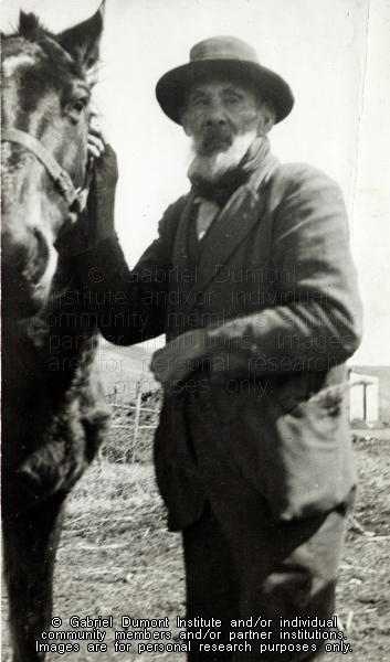 “Colbert St. Denis, Lebret, who remembered seeing (Cuthbert) Grant. One of the Red River hunters who followed the herds to the westword (sic). Born at St. François Xavier about 1846, and lived near Pierre Falcon. He remembers the song Pierre wrote to celebrate the victory of Seven Oaks.” Taken by Margaret Complin at Lebret, May 1934. “The name Cuthbert was pronounced Culbert, Corbet, or Colbert by the Half-breeds” Photographer – Margaret Complin |