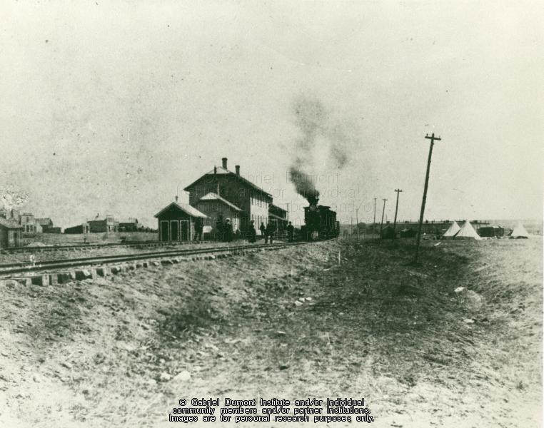| Title: | “North-West Rebellion – View of train arriving at station.” |
