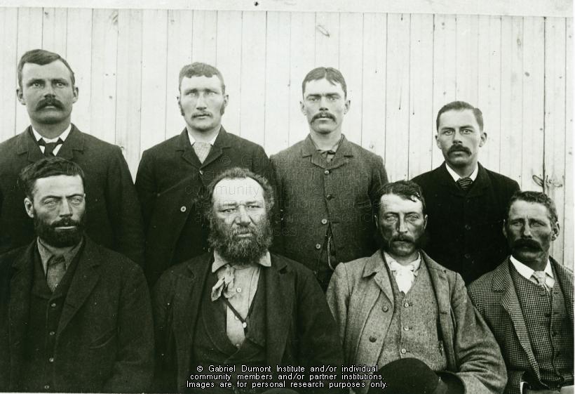 The men in this picture are: (Back row, left to right), William Tompkins, Harold Ross, Peter Tompkins, Eastwood Jackson. (Front row, left to right), George Ness, Charles Nolin, John Astley, Thomas Sanderson. Source: Bob Beal and Rod Macleod. "Prairie Fire: The 1885 North-West Rebellion." Edmonton: Hurtig Publishers, 1984, 298. |