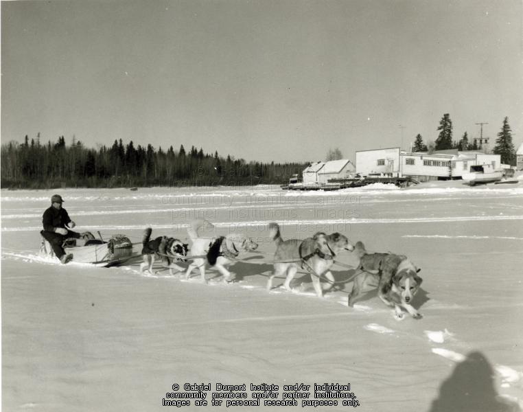 | Description: | “Dog Team owned and driven by Peter Isbister, La Ronge, crossing ice in front of Co-op fish plant, March 1963." |