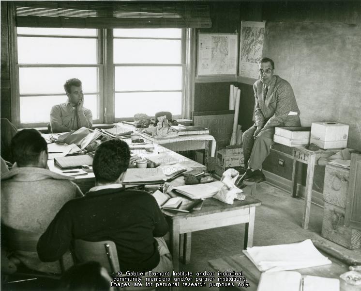 Mr. Malcolm Norris of the Dept. of Mineral Resources lecturing to a class of the D.M.R. Prospectors School at Lac La Ronge May 1956 |
