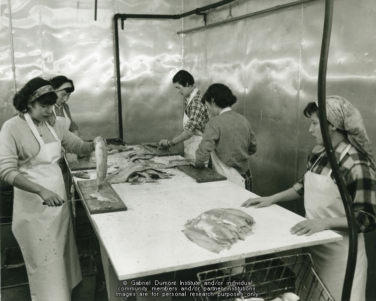 “Native commercial fishermen removing fish from the nets which have been pulled from under the ice at Hunter’s Bay, Lac La Ronge, Feb. 1957.” from Sask Deparment of Industry and Information  |