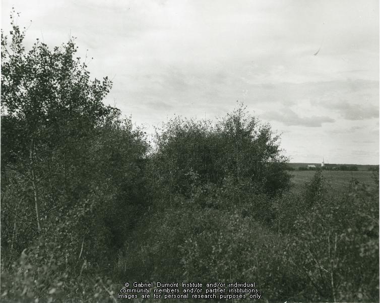 “Part of the trenching which was made by General Middleton’s forces during the Riel Rebellion, can be seen heavily overgrown by brush and young trees. In the distance, to the right of the trench is the Batoche Church and rectory”. The photograph was taken in Sept. 1957. |