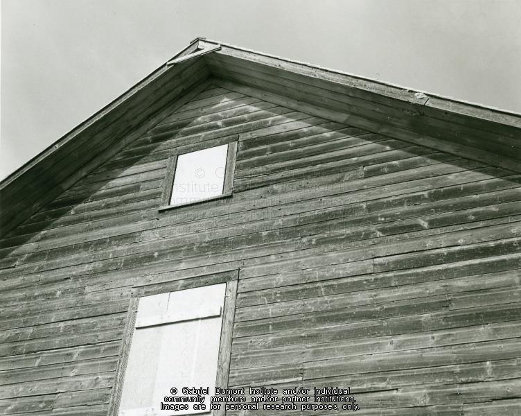 “Close-up view of the front of the rectory at Batoche. The bullet holes, seen near the upper window, to the right, were accidently made by the army during the Riel Rebellion.” The photograph was taken in Sept. 1957. |
