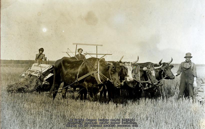 | Description: | "Power Farming,” team of oxen drawing a McCormick binder, with early settlers near North Battleford.