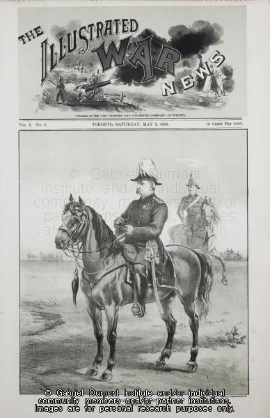 Description: Cover to The Illustrated War News, May 2, 1885. Note the title for this issue is not The Canadian Pictorial and Illustrated War News. Image of Major-General Frederick Middleton, commander of the Canadian Army during the 1885 Resistance. Also in the picture is Captain Wise, ADC. Vertical format and green wash. Acquired by the Gabriel Dumont Institute in April 2004.