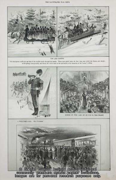 | Description: | This page contains two images. The first two images have the caption “Ups and Downs’ below them. In addition, they contain the caption from The Toronto Globe (the forerunner of The Globe and Mail): “ No description could give an idea of the terrible roads through the woods. There were pitch holes six feet deep, into which horses and sleighs would plunge unexpectedly, and throw the whole load on the tail-board or the haunches of the horses”. The second image, “ A Welcome Call: ‘Hot Potatoes’”, is of a bugler playing in front of soldiers. The third image, “Scene on the Cars En Route to the Front”, shows soldiers sleeping in a railway car. The final image, “Presentation of Flag to the Toronto Volunteers at Carelton Place, By Mrs. Edward Blake”, is the most politically-charged image on this panel. Edward Blake was the federal Liberal leader during the 1885 Resistance – a few years prior to Wilfrid Laurier assuming power. When he was premier of Ontario in the 1871, he put a bounty on Louis Riel for the execution of Thomas Scott during the Red River Resistance. |