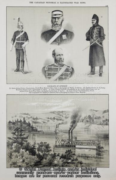 This page contains sketches in the top panel and one image in the bottom panel. All images appear vertically and are in a washed-out green. The captions for the four sketches in the top panel include: (1) “Lieut.-Colonel Irvine, Commissioner, North-West Mounted Police, from a photograph by Topley of Ottawa”; (2) Captain Stewart, of the Rocky Mountain Rangers, from a photograph by Topley; (3) Lieut.-Colonel Turnbull, Commandant of the Calvary School Corps, now on service in the North-West, from a photograph by Livernois of Quebec”; (4) Lieut.-Colonel Van Straubenzee, D.A.G. who commanded the infantry at Batoche, from a photograph by Fraser & Sons, Montreal”. The lower image “The Steamer Marquis Poiling off a Shadow in the Saskatchewan” it was drawn by F.W. Curzon, “our Special Artist with Gen. Middleton’s Expedition”. |