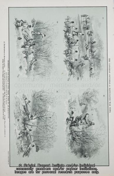| Description: | This page contains four sketches in a horizontal and washed-out green format and was based on sketches by F. W. Curzon. In these images, soldiers are engaging Métis and First Nations at the Battle of Fish Creek, April 24, 1885. The captions include: “The first advance on the enemy’s position”; “The death of Private Ferguson, 90th Batt., the first man shot death’; “Capt. Wise, A.D.C., undertakes to avenge the death of his charger, and himself gets shot”; and “Grenadiers taking pot shots at the enemy”. |