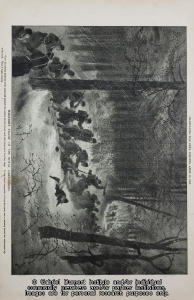 | Description: | This page, which appeared in the April 18 1885 edition of The Canadian Pictorial & Illustrated News, contains a horizontal sketch of the Royal Grenadiers marching through snow late at night. The sketch has the following caption: “Into the solemn darkness of the pines and hemlock the column slowly moved, each side being snow four feet deep. It is almost impossible to keep the track, and a mis-step buried the unfortunate up to his neck. Then it began raining…” |