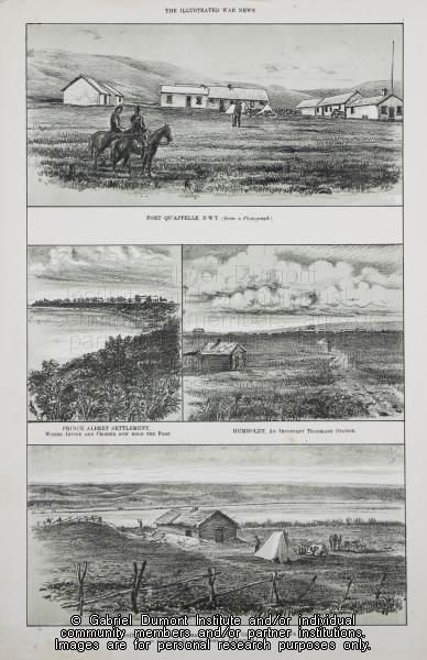 Description: On this page, there are four vertical, green-washed sketches of various places in present-day Saskatchewan. Captions for the images include: “Fort Qu’Appelle, N.W.T. (from a Photograph)”; “Prince Albert Settlement, Where Irvine and Crozier Now Hold the Fort”; “Humboldt, An Important Telegraph Station”; and “Clarke’s Crossing, on the South Saskatchewan, Where General Middleton’s Expedition is Expected to Cross (from a Photograph)”. Irvine and Crozier refer to North-West Mounted Police Commissioner Acheson Gosford Irvine and Superintendent Leif Crozier. General Middleton’s expedition did indeed cross at Clarke’s Crossing, which is near present-day Saskatoon.