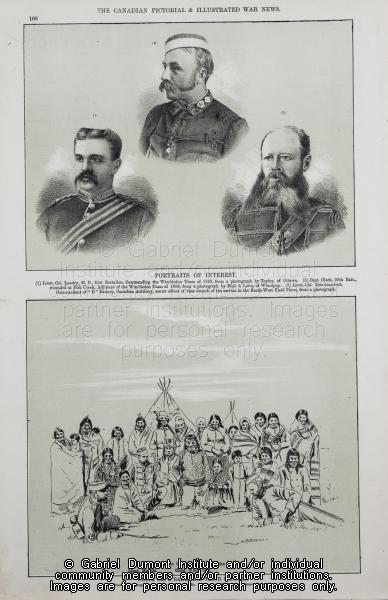 | Description: | This page contains two panels containing portraits of Canadian soldiers and an image of White’s Band and their captors. Captions for the “Portraits of Interest” read: “(1) Lieut-Col. Landry, M.P., 61st Battalion Commanding the Wimbeldon Team of 1885”; “(3) Capt. Clark, 90th Batt., wounded at Fish Creek, Adjutant of the Wimbeldon Team of 1885, from a photograph by Hall & Lowe, of Winnipeg”; and (2) Lieut.-Col Montizambert, Commandant of ‘B’ Battery, Canadian Artillery, senior officer of that branch of the service in the North-West Field Force”. The caption for the White Cap image lists Chief Whitecap, his wife and daughter – although their personal names are not given. The Dakota chief was imprisoned during the 1885 Resistance because some members of his band fought with the Métis during the Battle of Batoche, (May 9-12, 1885).