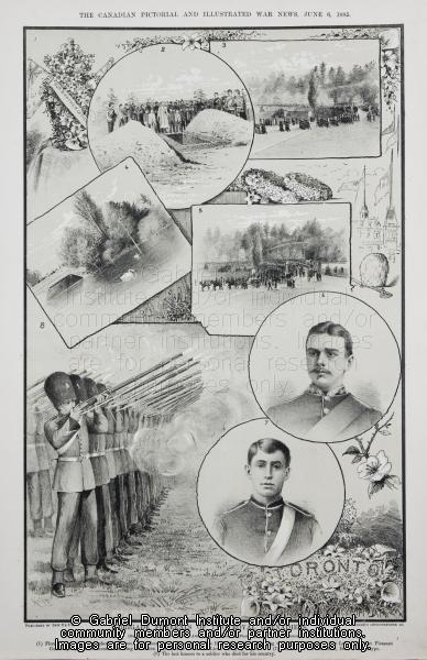 | Description: | This page, from June 6, 1885, contains eight horizontal inset sketches relating to the funeral of two Canadian soldiers killed during the 1885 Resistance. Captions include: “(1) Floral Tribute”; “(2) Scene at the Grave”; “(3) The Royal Grenadiers following their late Officer”; “(4) The Lake in Mount Pleasant Cemetery”; “(5) The Procession entering the Gates”; “(6) Portrait of the late Lieut. Finch”; “(7) Portrait of Private Moor, from a Ferrotype”; and “(8) The last honors to a soldier who died for his country”. |