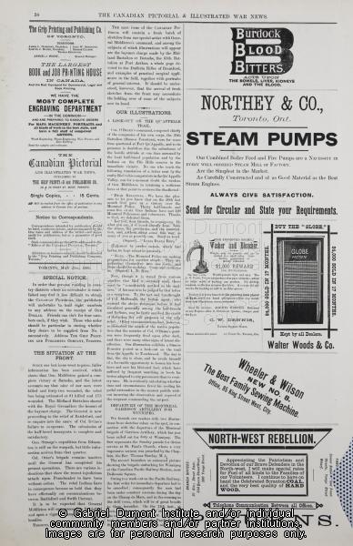Description: On this page, (pg. 58, The Canadian Pictorial & Illustrated War News, May 23, 1885), correspondents write about events that took place during the 1885 Resistance including information relating to the military campaign. Writers also provide contextual information relating to images that are part of this collection. There is also a reprinting of an intercepted letter that was allegedly written by Louis Riel regarding the Métis victory over the Mounted Police and Volunteers at the Battle of Duck Lake (March 26, 1885). The letter was intended for the Métis of the Qu’Appelle Valley and urged them to take up arms: “Let you dear friends, be courageous. Do what you can, if it not already done. Take the stores, the provisions, and the ammunition, and without delay come this way, as many of you as possibly can”. Of note on this page are advertisements that delineate late nineteenth-century tastes.